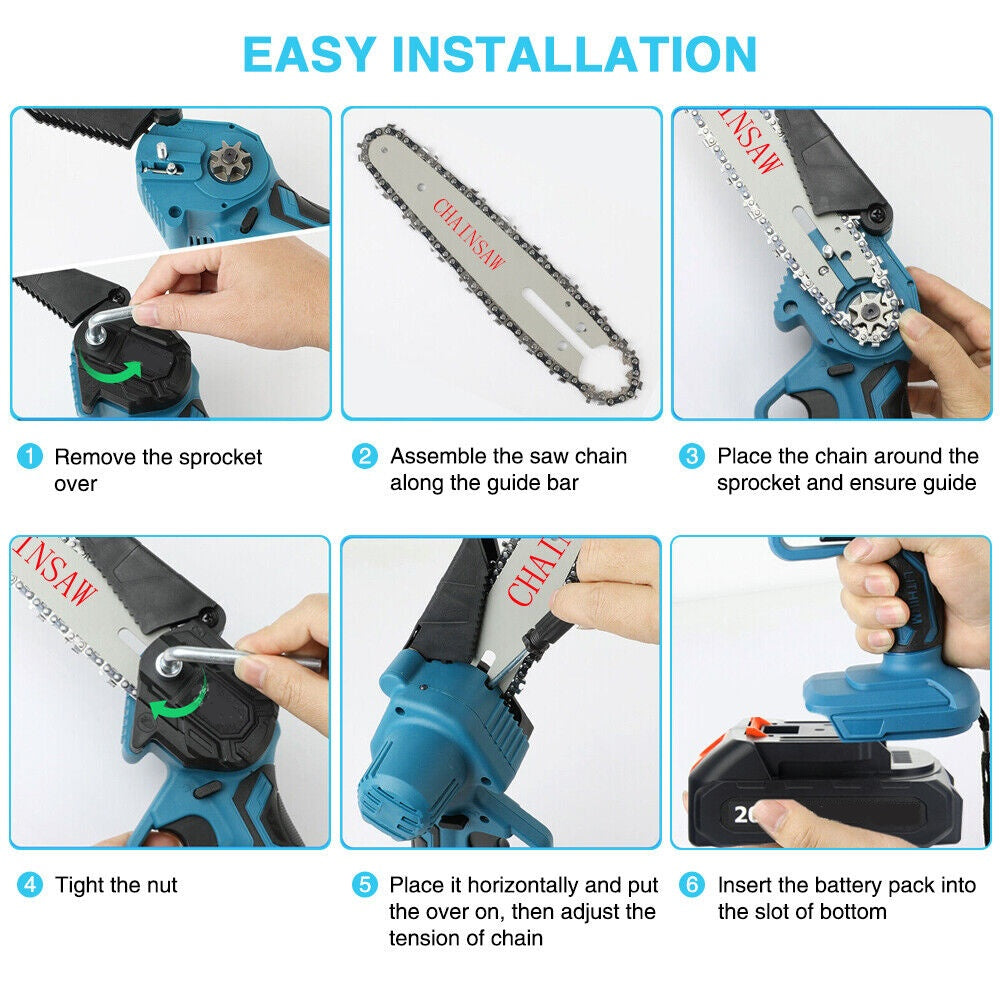 21V Mini Chain Saw 4-6 Inch Wireless Single Hand Saw Wood Cutter 2 Batteries