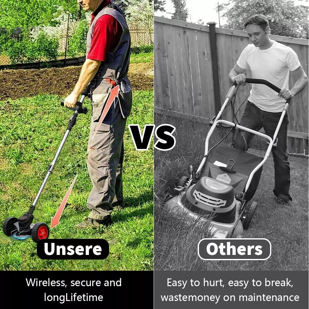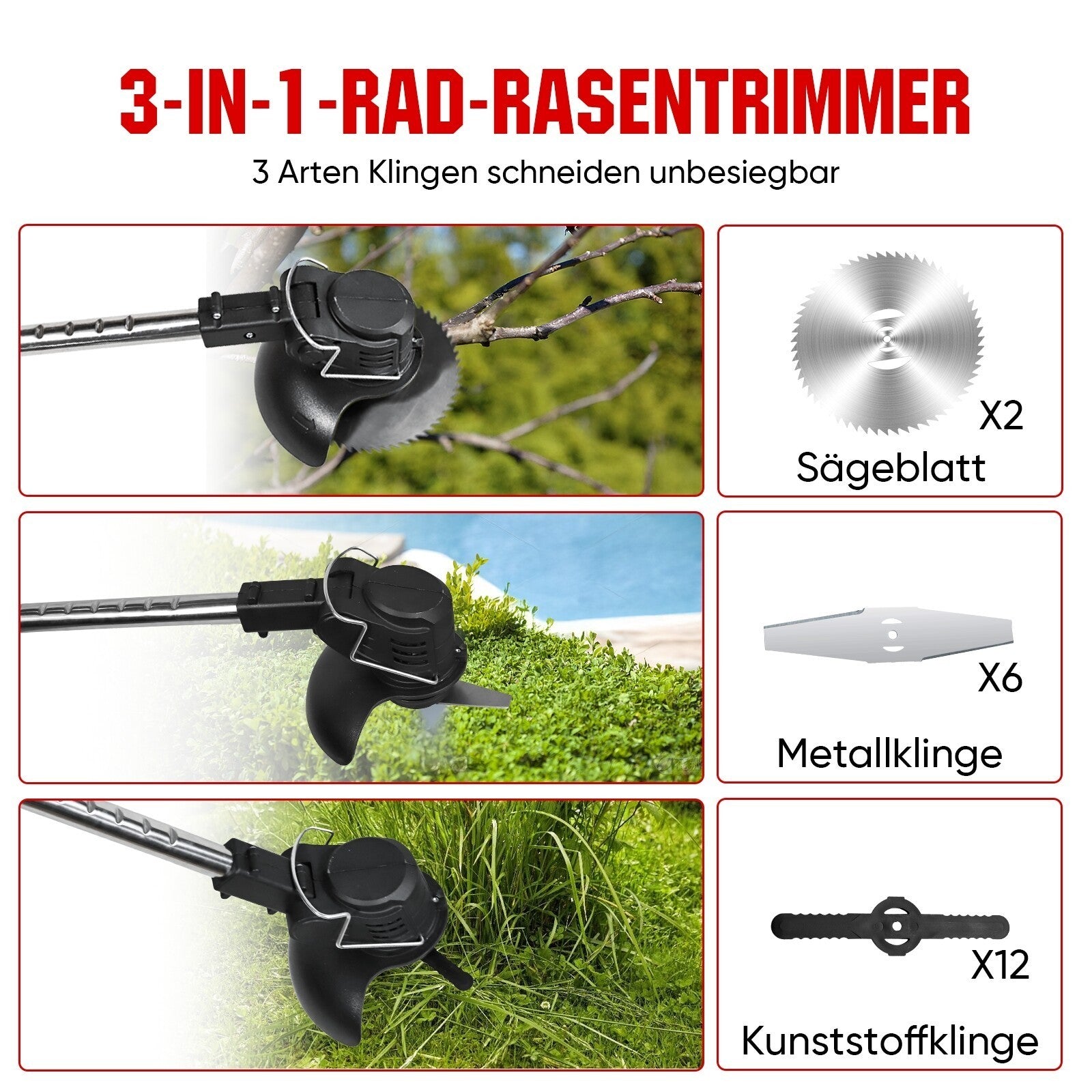 ãSeitenschneidmesserãViele Rasenkantenschneider mit Rädern brennen wegen des Grasschnittes, der im Motor stecken bleibt. Unser Grasschneider setzt die Seitenschneidklinge neben den kabellosen elektrischen Strimmer mit einem Akkumotor, der Grasschnitt zerkleinern kann, um den Motor des Freischneiders zu schützen und die Lebensdauer des schnurlosen Unkrautvernichters mit Akku und Ladegerät zu verlängern