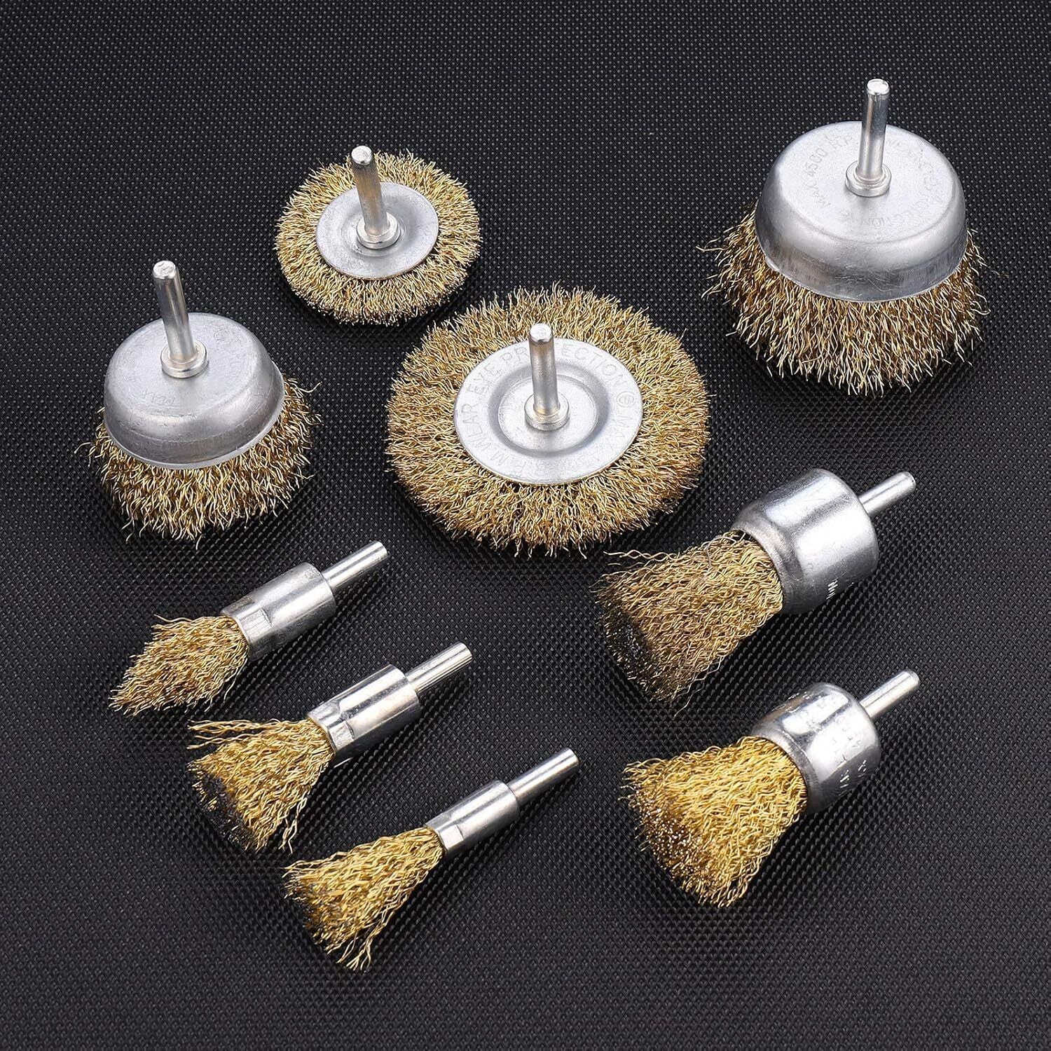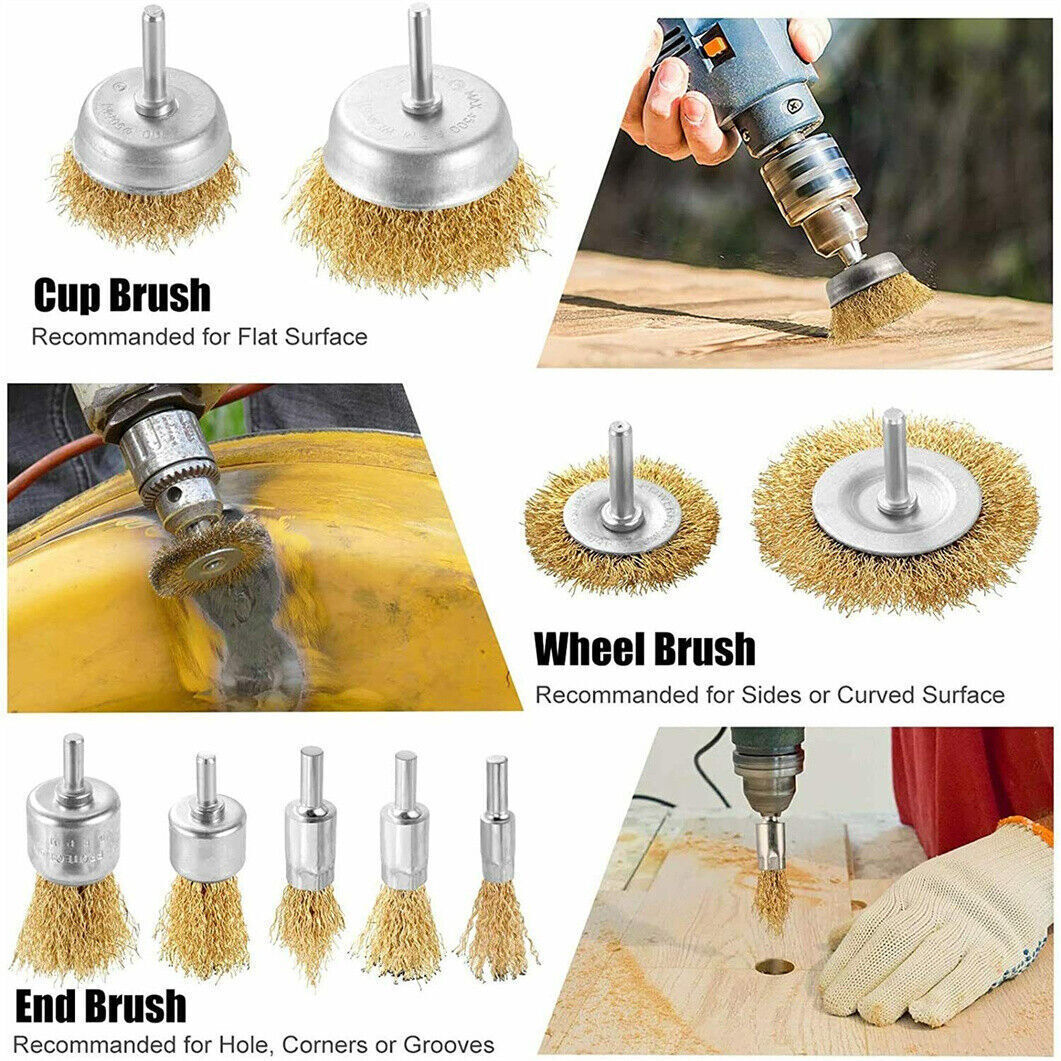 【Flexibles Set】Sie erhalten 9 verschiedene Drahtbürstensets, die mit Ihren Anwendungen zufrieden sind, mit 4-teiligen Kreisbürsten, 2-teiligen Becherbürsten, 5-teiligen Drahtendbürsten und 1-teiliger Kegelbürste. Dieser Pinselsatz kann für viele verschiedene Objekte verwendet werden, z. flache, gekrümmte oder unebene Oberflächen.