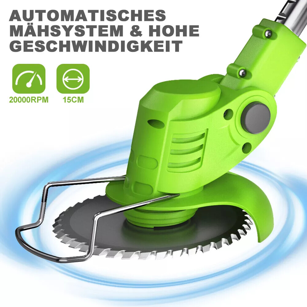 Der Akku-Rasentrimmer enthält 2 wiederaufladbare 20 V / 2000 mAh Hochleistungs-Lithiumbatterien. Akku-Rasentrimmer mit 1200W-Hochleistungsmotor, die Geschwindigkeit kann 21000 U/min erreichen. Rasenkantenschneider mit Rad sparen Jäten so einfach wie zu Fuß, verbessern die Arbeitseffizienz und sparen Zeit.