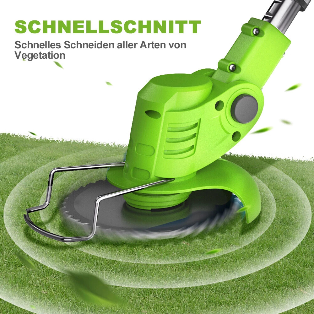 Viele Rasenkantenschneider mit Rädern brennen wegen des Grasschnittes, der im Motor stecken bleibt. Unser Grasschneider setzt die Seitenschneidklinge neben den kabellosen elektrischen Strimmer mit einem Akkumotor, der Grasschnitt zerkleinern kann, um den Motor des Freischneiders zu schützen und die Lebensdauer des schnurlosen Unkrautvernichters mit Akku und Ladegerät zu verlängern.